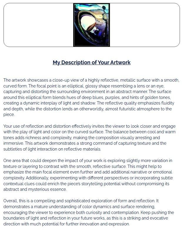 I was curious to see how AI would critique the image I posted recently, "Masters of Matter". Although I was pleased to see this AI program recognized the central image as a tilted space craft reflecting the desert landscape it failed to confirm the presence of the alien being, (In black), emerging from the side of the craft vertically. This only concludes to me that AI programs have limitations as a critiquing device for art.